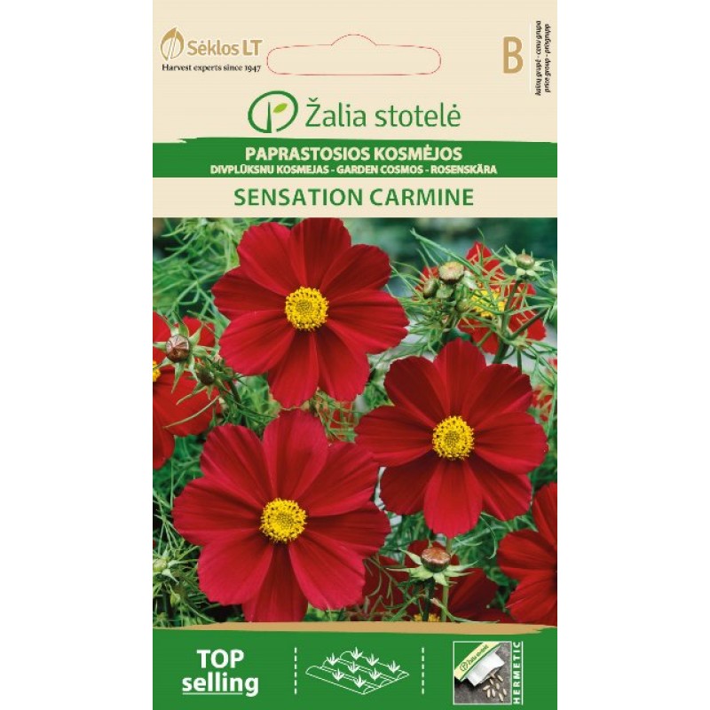 Kosmose Sensatsioon Karmini40–50 cm kõrgusele. See on ideaalne valik, et tuua värvi ja ilu oma aeda või rõdule. Kosmose lilled on lihtsad kasvatada ja nende õitsemine on rikkalik ning pidev, isegi vaesemas pinnases.