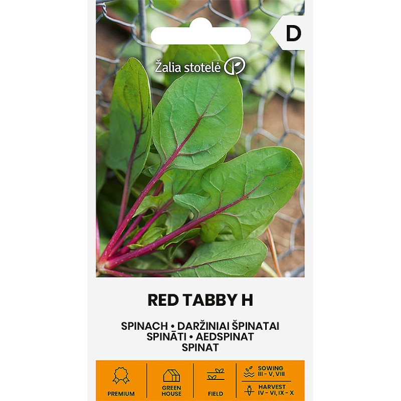 Punane tabby H spinat on varajane hübriid, mis on vastupidav jahukastele. Lehed on tumerohelised, punaste varte ja veenidega, mis lisavad aiandusele värskendavat ilmet.