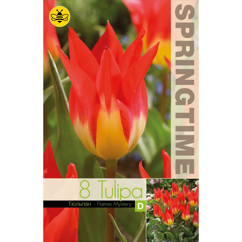 Too värvikas Flames Mystery tulp toob kevadesse erksad punased õied, millel on silmatorkav kollane aluspind. See mitmeaastane taim õitseb varakult kevadel ja sobib suurepäraselt lillepeenardesse, tuues rõõmu nii aednikule kui ka külalistele.